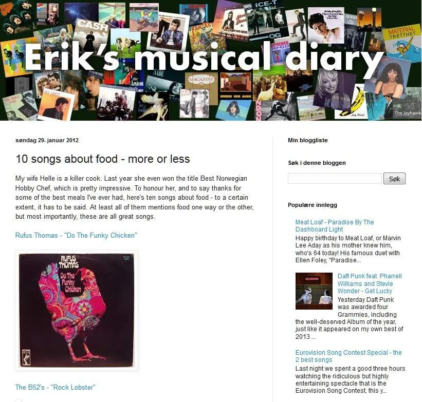 Mannen min, Erik har en fabelaktig musikkblogg. I dag har han skrevet et innlegg om låter som handler om mat. Klikk deg inn på bloggen hans og hør alle ti forslagene: