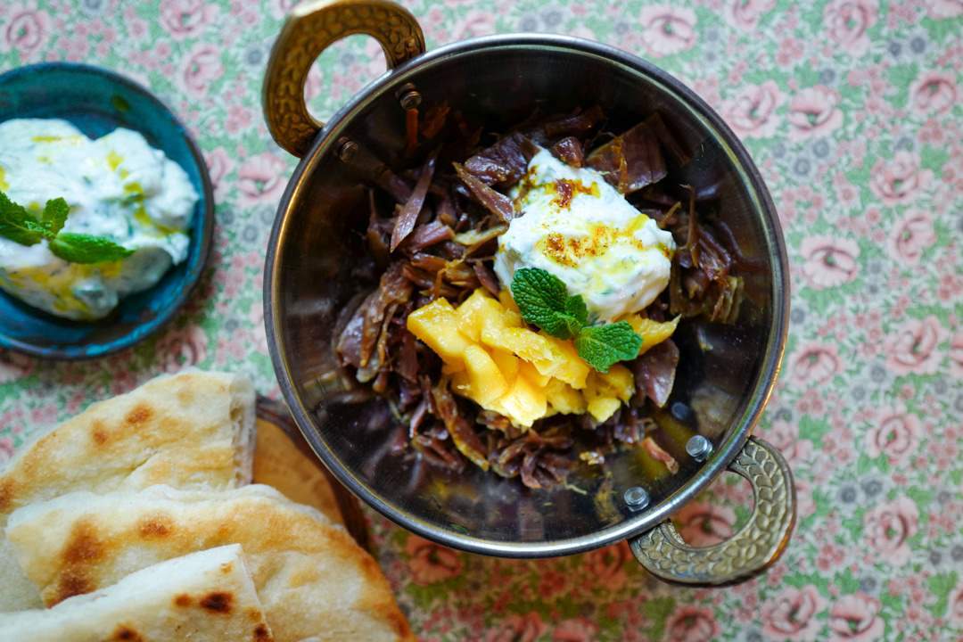 Pinnekjøtt med naan, raita, mango og karriolje