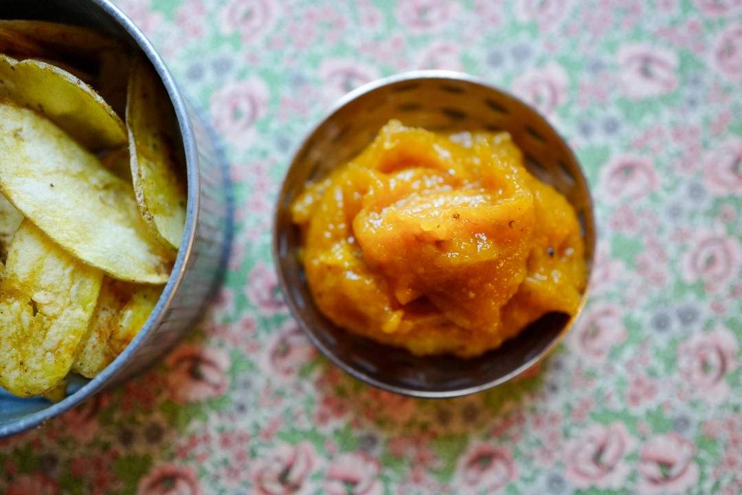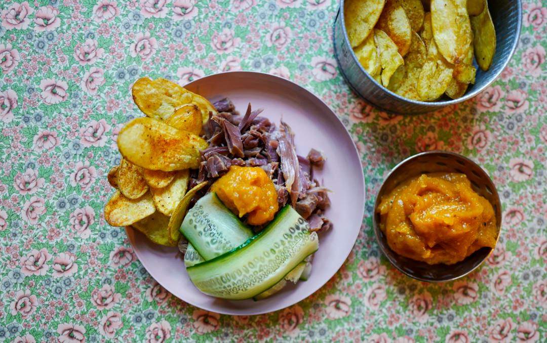 Varm pinnekjøttet og server med agurk, chips og aprikoskrem.