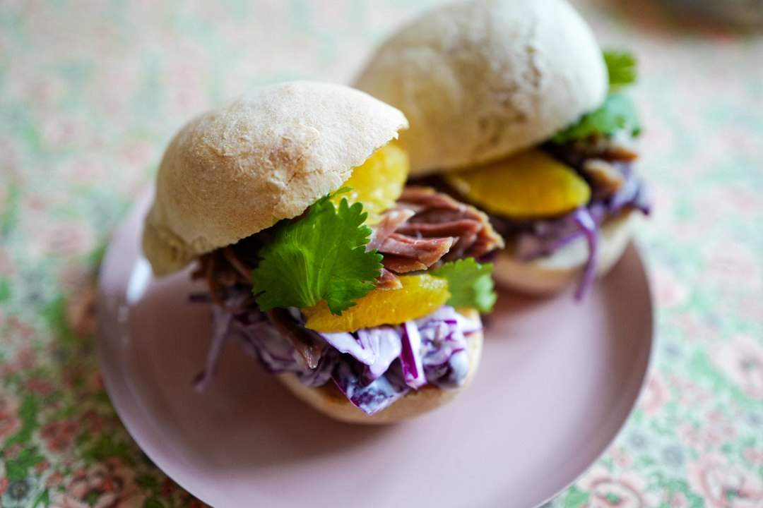 Del slidersbrødet i to og fyll det til randen med oppvarmet pinnekjøtt, rødkålslaw og appelsinsegmenter. Pynt med koriander.