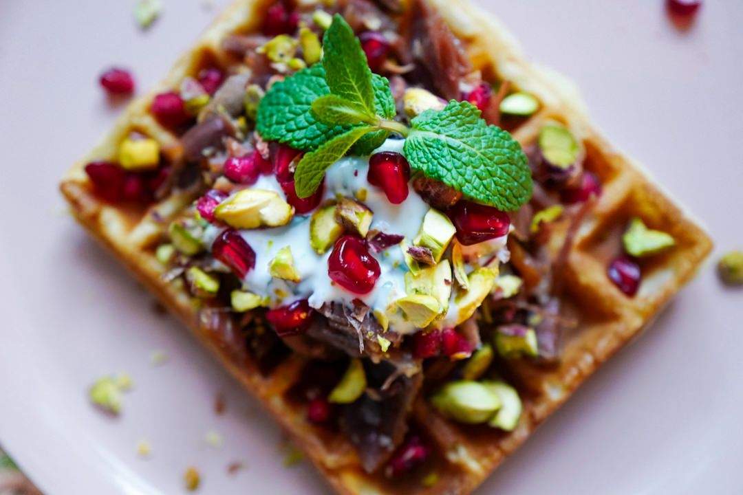 Vaffel med pinnekjøtt, myntedressing, granateple og pistasj