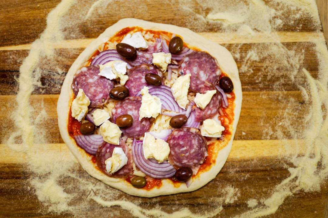 • Stek i ovnen/grillen/pizzaovn på maks temperatur til pizzaen er gyllen, sprø og lekker.