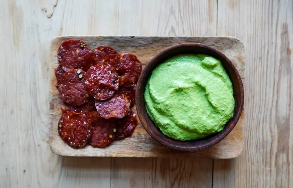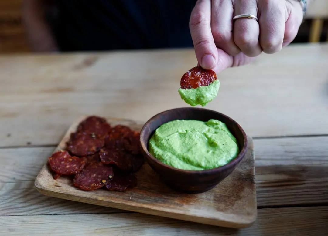 Salamichips laget av Slegge med dipp av mynte, erter og fetaost