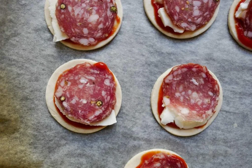 Smør et tykt lag tomatsaus på hver sirkel. Skjær skiver av Passe (fennikelsalami) og legg på sausen. Legg en skive mozzarella på toppen. Sett i ovnen. Følg så med. For butterdeig er en luring og den vil yppe underveis i stekingen. Med dette mener jeg at den vil heve seg såpass at den må presses ned forsiktig med en stekespade. Sklir fyllet av, legger du det på plass igjen.