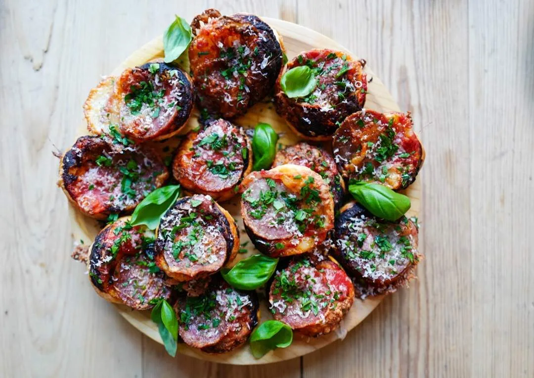 Finriv litt parmesan over dem når de er tatt ut av ovnen og strø litt finhakket basilikum over.