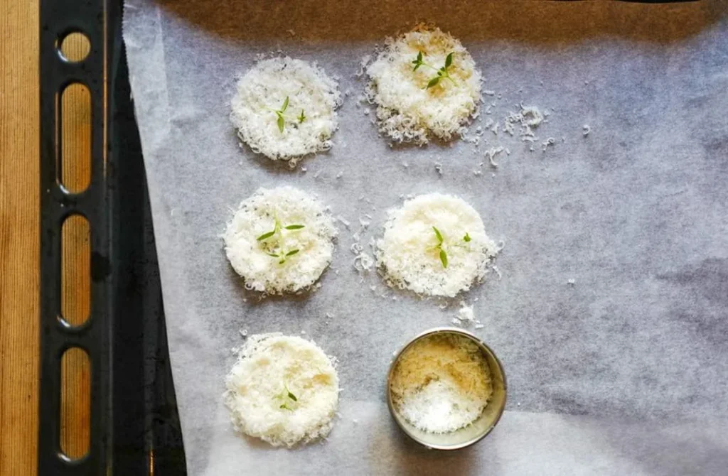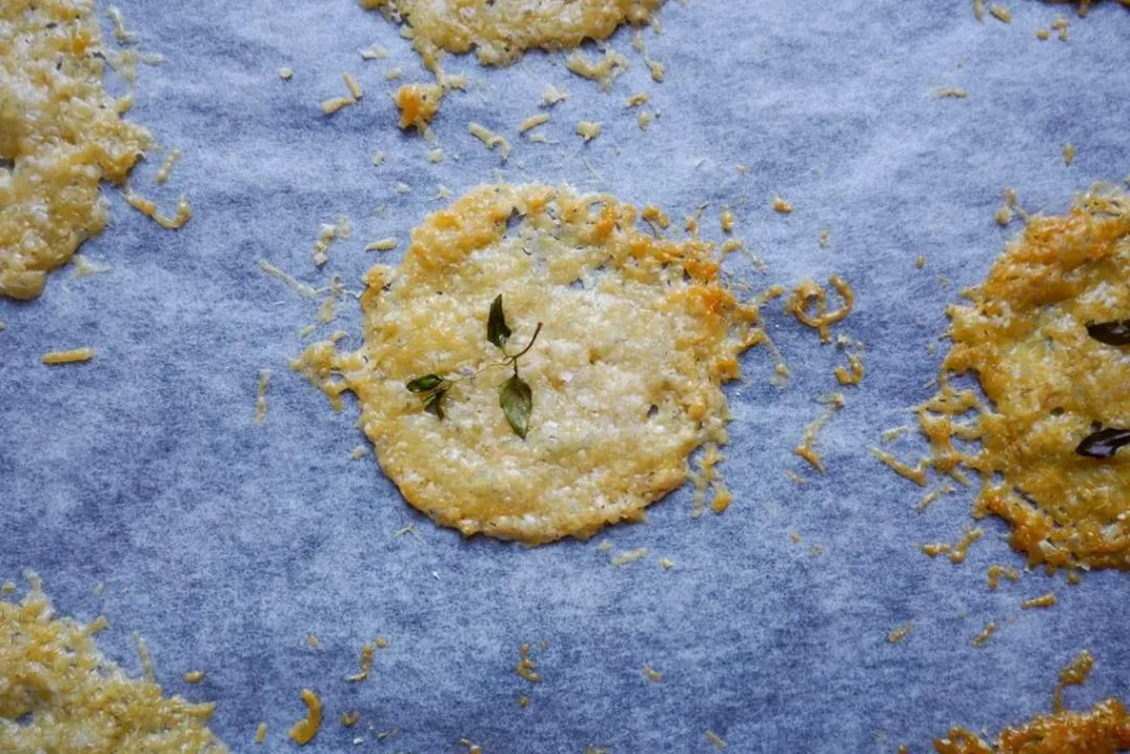 Bruk en rund form og trykk forsiktig ned litt finrevet parmesan i formen. Ta bort formen og lag flere sirkler. Legg en liten kvist timian på toppen. Stek i ovnen på 200 g til parmesanen er smeltet og lett gyllen. Ta ut av ovnen og avkjøl. Vipp forsiktig parmesanchipsen fra papiret.