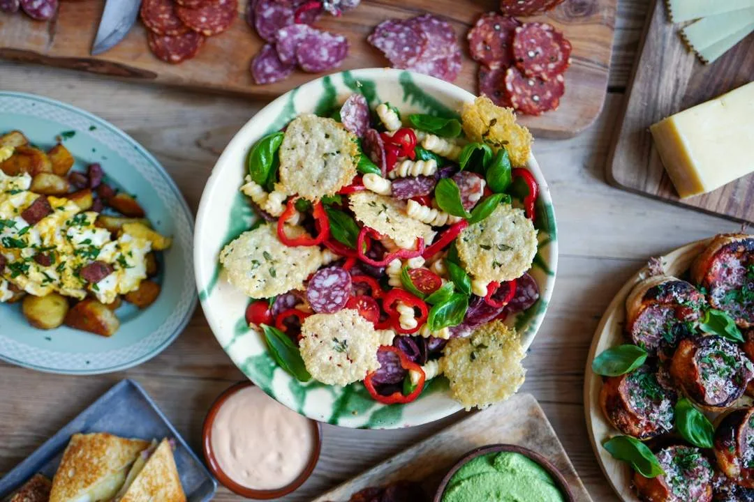 En god salat er alltid en hit på bordet. Jeg bruker god kvalitetspasta og gode grønnsaker til min salat. Skiver av Holy Baloney sammen med chips laget av parmesan var en ekte match made in heaven.
