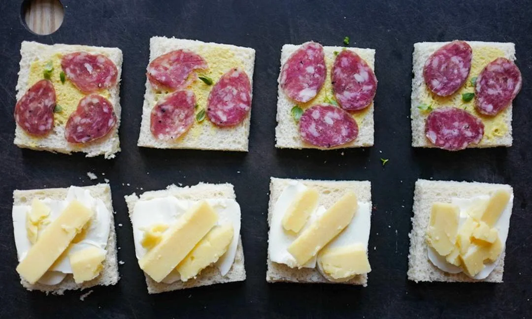 Smør hver brødskive og legg smørskiven ned på skjærebrettet. To og to skiver i høyden. Smør et tynt lag dijonsennep på en av skivene. Legg på noen timianblader og så noen tynne skiver trøffelsalami. Gjør dette på hele rekka med brødskiver.