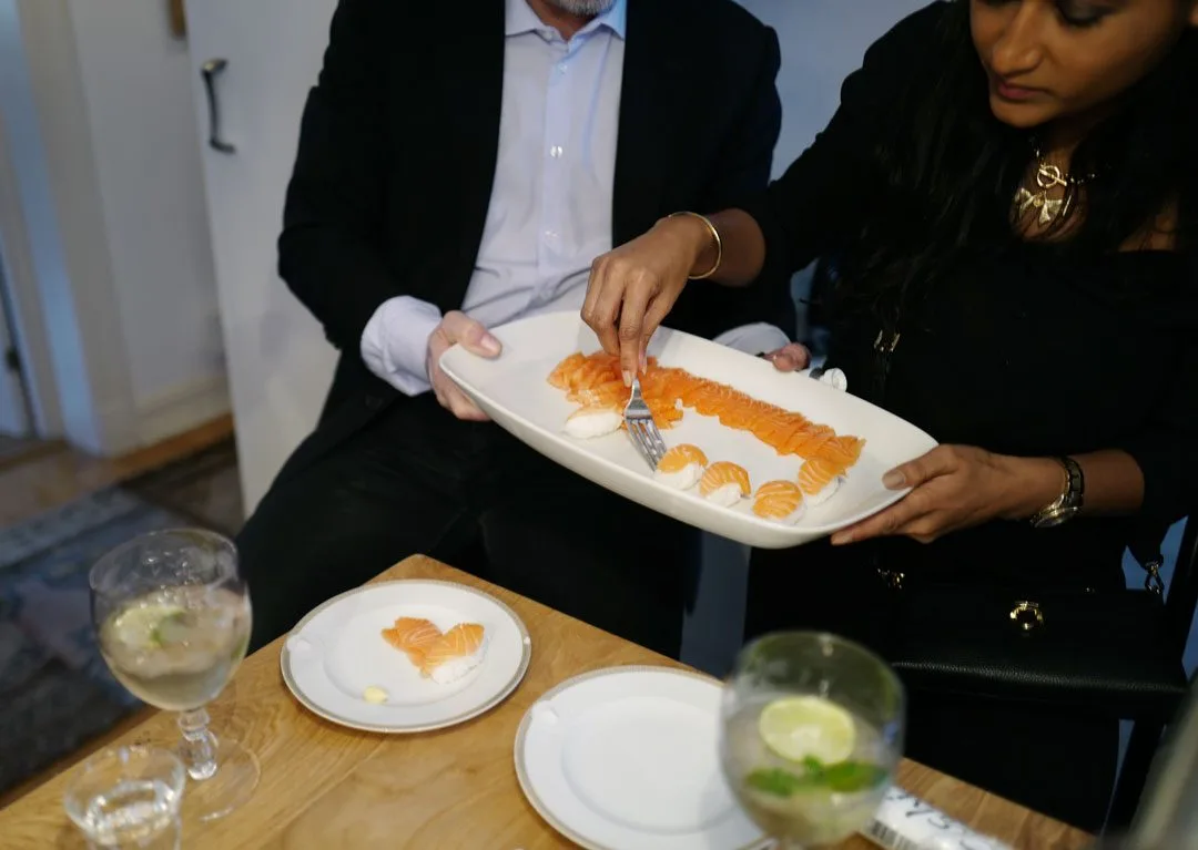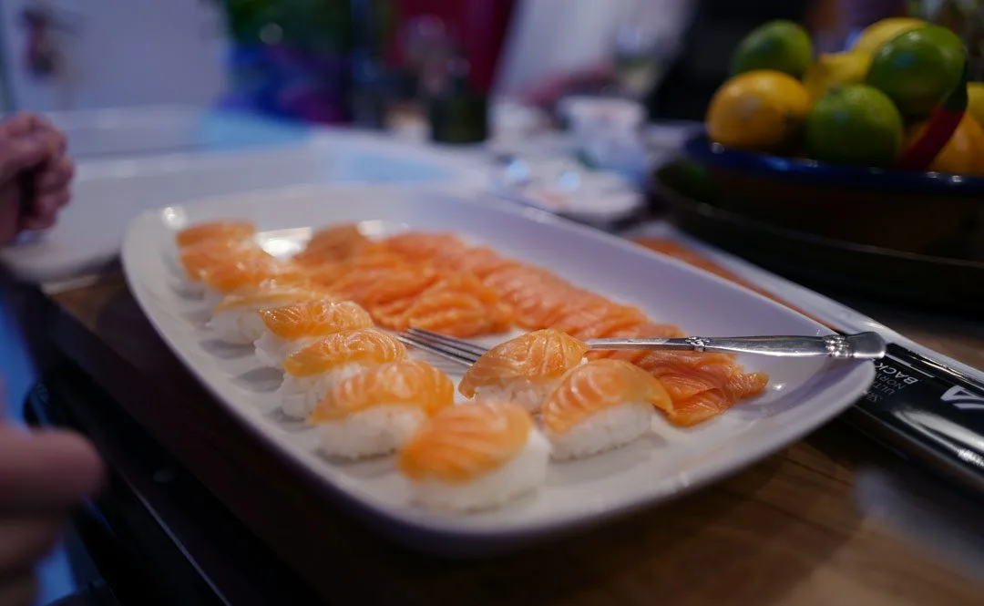 Til og begynne med startet vi med Hugo – den lette, friske drinken laget med prosecco og hylleblomst. Vi hadde en superlett og frisk cava som vi brukte, og det fungerte veldig fint. Til dette serverte vi sushi. Deilige nigiri og sashimi med wasabi- og chilimajones, wasabi, ponsusaus og rogn til. En super start og drinken passet meget godt til.