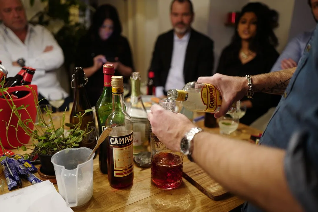 Daniel lager mat i både vannbad, pizzaovnen og komfyren, og straks kommer maten på bordet. Men først skal Erik lage sin favorittdrink, Negroni. Den hadde de fleste aldri prøvd før og den ble straks en storfavoritt blant flere av gjestene.