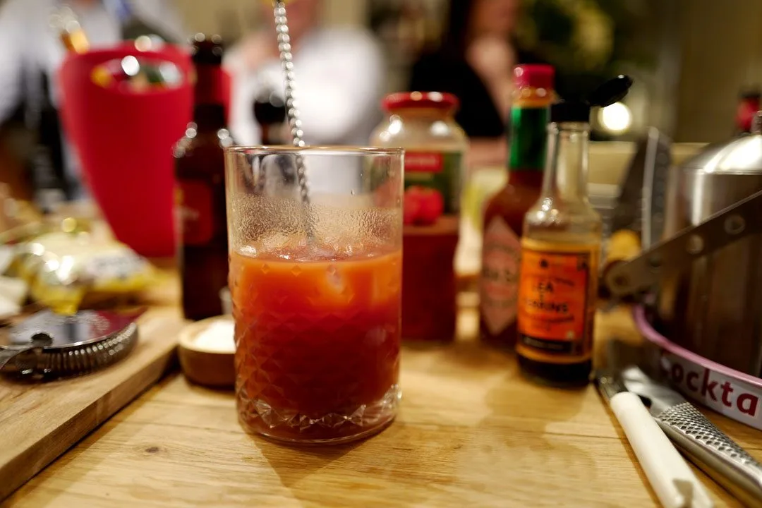 Så til hovedretten. En stor indrefilet av okse, sous videt og stekt til perfeksjon av Daniel. Til dette serverte han quinoa og couscous med craisins (tørkede tranebær), confitert løk med masse chipotle og en deilig salat med skogssopp. Hva drikker man til det? Jo, en Bloody Mary selvsagt!