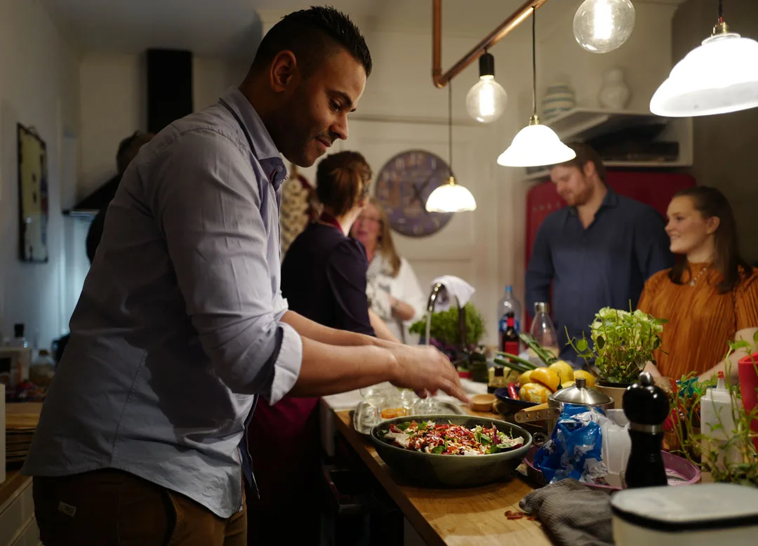 Daniel lager mat i både vannbad, pizzaovnen og komfyren, og straks kommer maten på bordet. Men først skal Erik lage sin favorittdrink, Negroni. Den hadde de fleste aldri prøvd før og den ble straks en storfavoritt blant flere av gjestene.