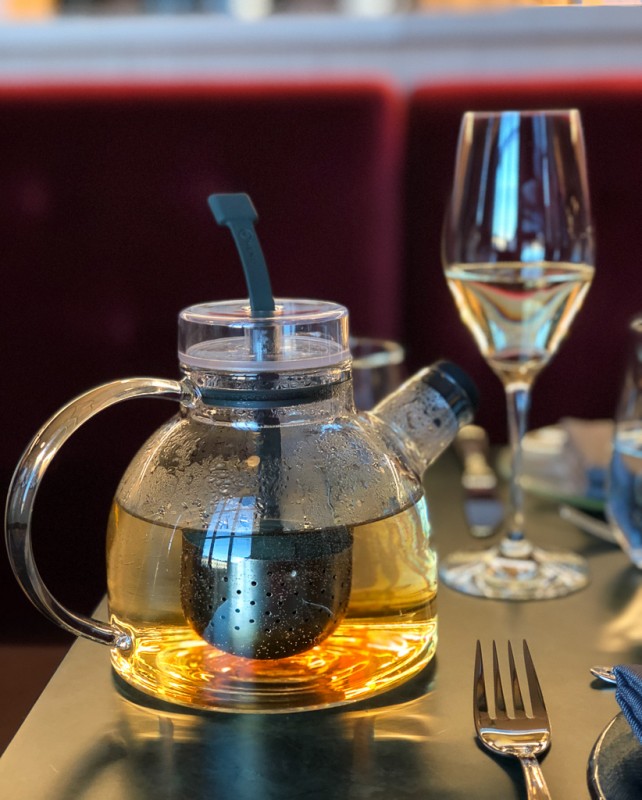 Både teen og champagnen passer så godt til maten. Darjeeling var et godt tevalg. Den er ikke så tannin-tung og derfor helt ukomplisert i møte med de mange smakene.