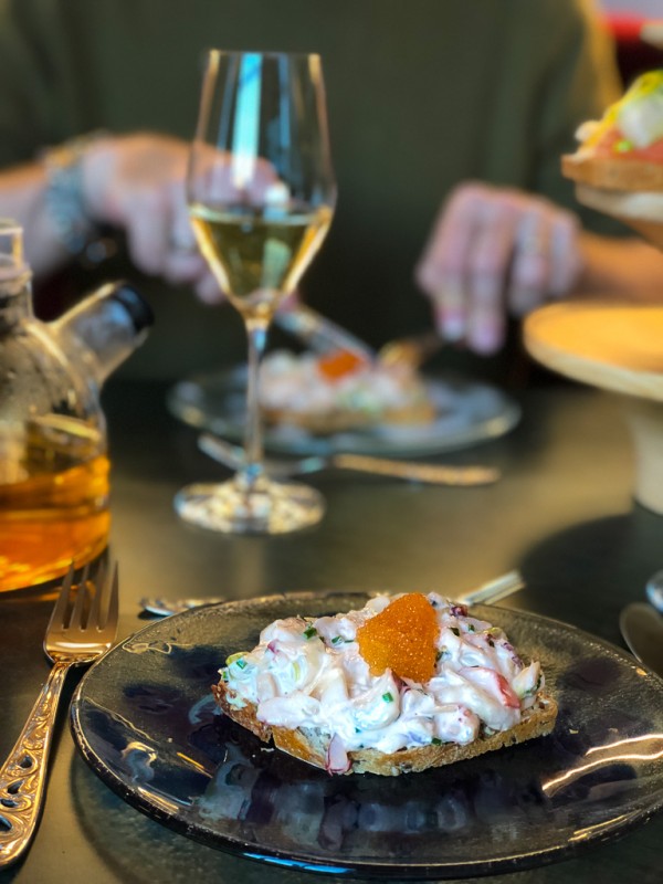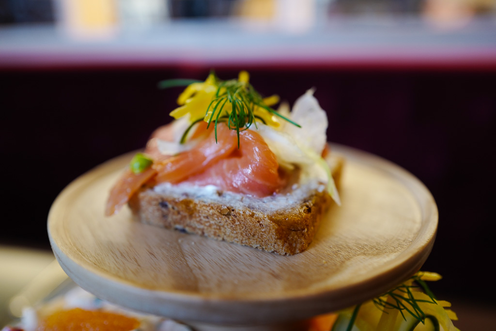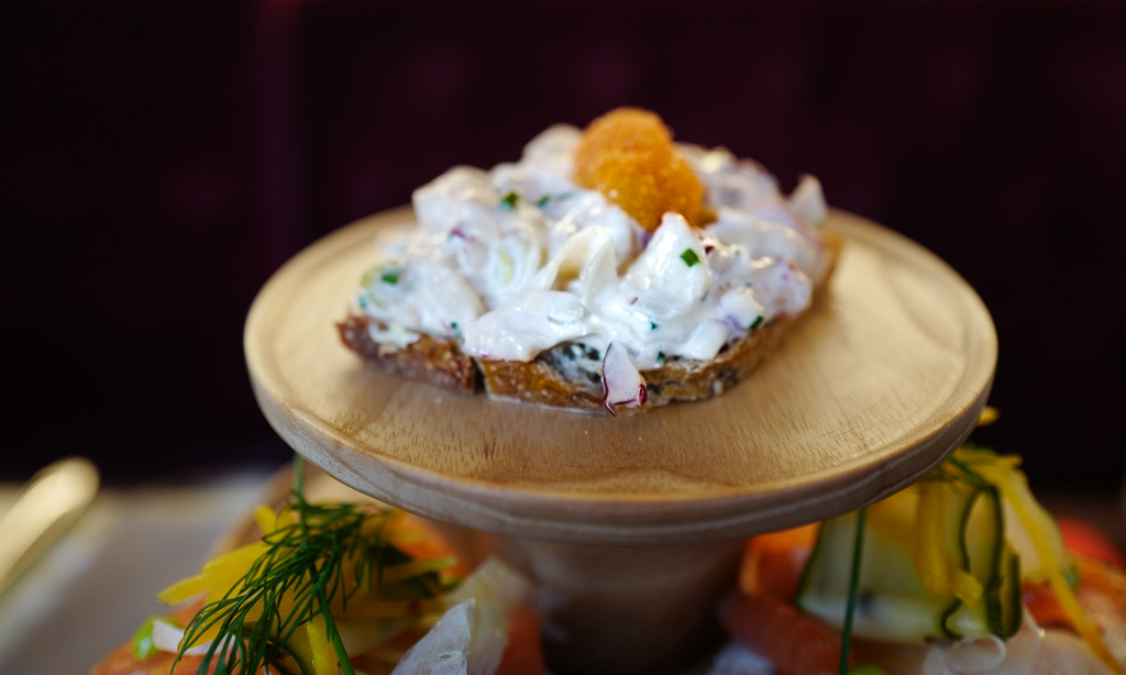 Vi glemmer fort hintet av skam og går over til laksesmørbrødet. Man må ha laks på menyen. Det er obligatorisk. Men denne varianten er så langt fra en kjedelig snitte som du kan komme. Hver bit er en nytelse. En perfekt mengde Snøfrisk-ost mot den delikate laksen. Deilig syrlighet fra agurken og sødme fra gulbetene.