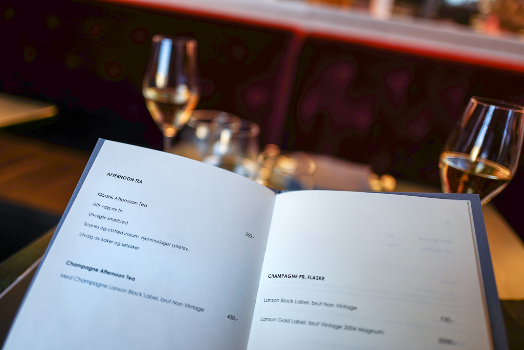 Jeg er her for å nyte Afternoon Tea med min kjære. Dette er noe jeg har gledet meg til. Vi går «all in» og bestiller Champagne Afternoon Tea. Prisen er 450 per person med champagne og 350 kroner per pers for klassisk Afternoon Tea.
