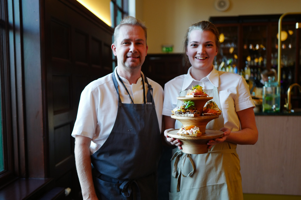 – Du får først tre halve smørbrød, så kommer scones og kaker. Til dette får du eksklusiv te fra Perchs og champagne, sier Jon Edmund.