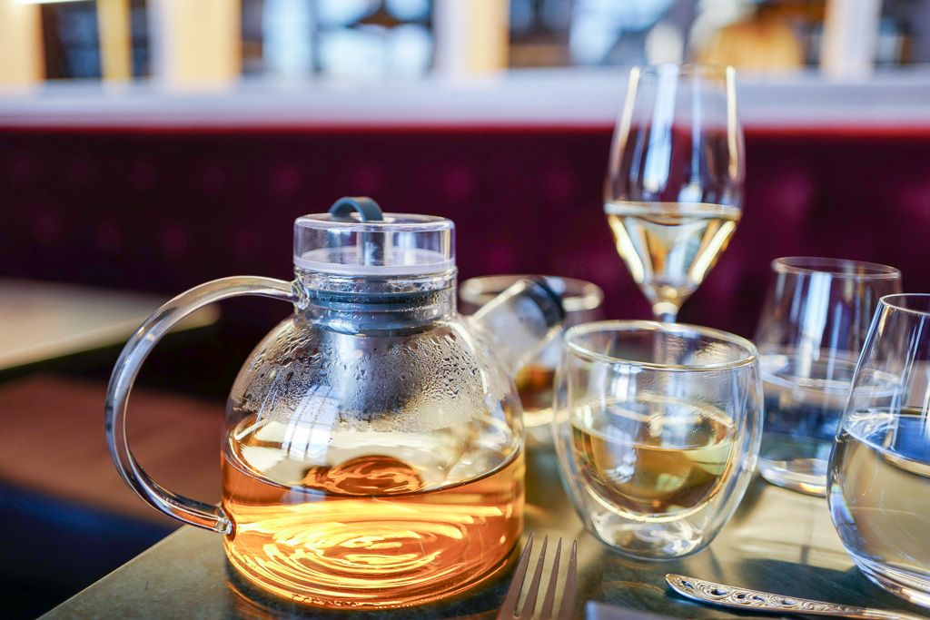 Hovmester Anna anbefaler te til maten. Vi går for Darjeeling first flush – en mild sort te. Den kommer inn i kanne og med timer. Når det ringer, er teen ferdigbrygget og Anna kommer og trekker opp silen fra kannen.