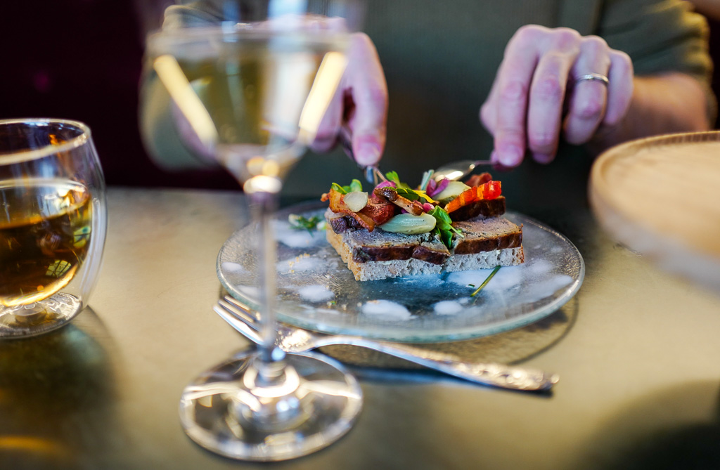 Du kan få litt å bite i baren når kaféen stenger klokken 19:00. Jon Edmund har nemlig lagt ned tre typer sild som serveres med godt brød til. Dette er perfekt mat til øl og hjemmelaget snaps når du trenger en cocktailpause.