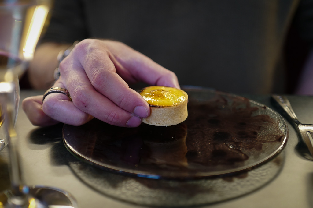 Øverst ligger små terter fylt med crème brûlée og pasjonsfrukt. Dette er Jon Edmunds kreasjon fra tiden han jobbet for Bent Stiansen på Statholdergaarden. Det er en drøm av en terte. En munnfull av lykke og luksus.