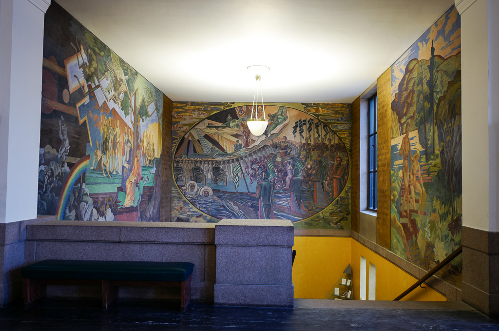 Det ble bygget i 1913. Når du går gjennom svingdøren, som for øvrig er Nordens eldste av sitt slag, blir du møtt av en fantastisk himling med en gigantisk lysekrone og fresker av Emanuel Vigeland.