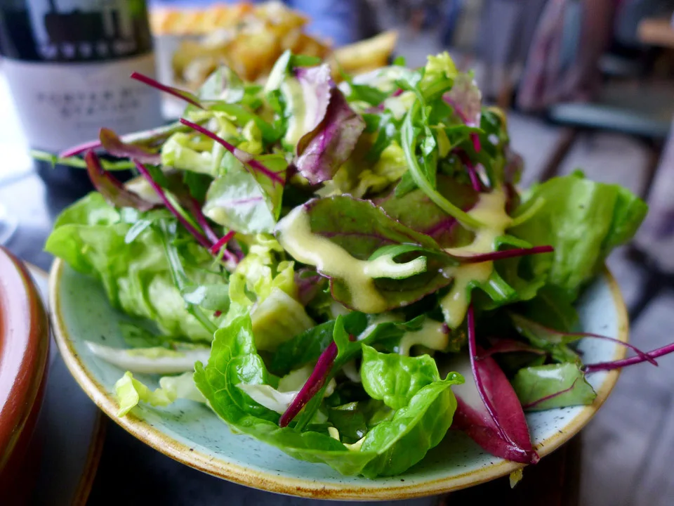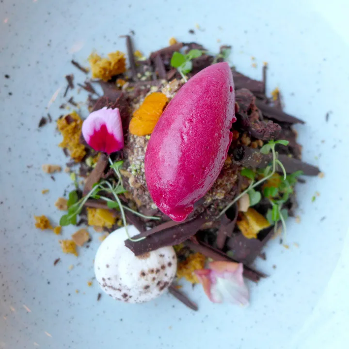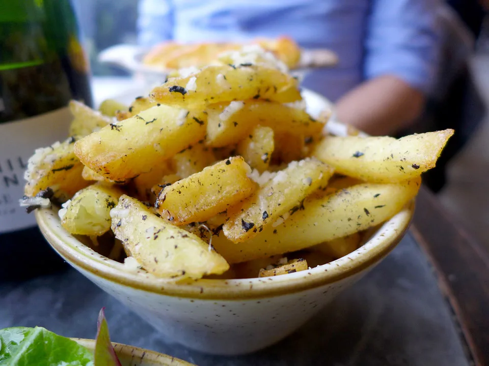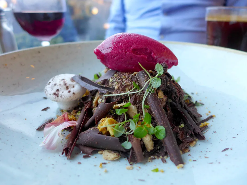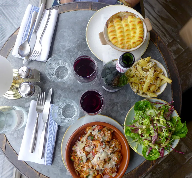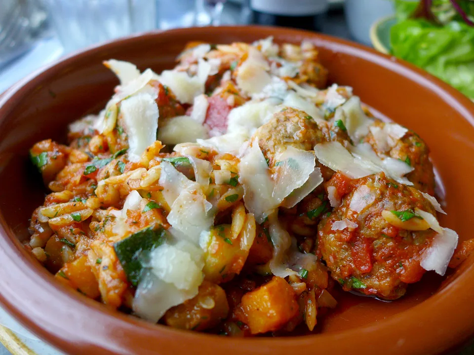 Jeg klarer såvidt å styre unna en cocktail, tyr til fornuften og bestiller heller en flaske vin på deling med Erik i stedet for. Vi bestiller hver vår deilige varmrett: Shepards pie med andeconfit og viltkjøttboller i en spicy tomatsaus med orzo (pastaris). Vi bestiller nydelige trøffel-chips til og en deilig grønn salat. Frister med trøfler igjen etter å ha vært på Gotland og spist trøfler en hel helg.