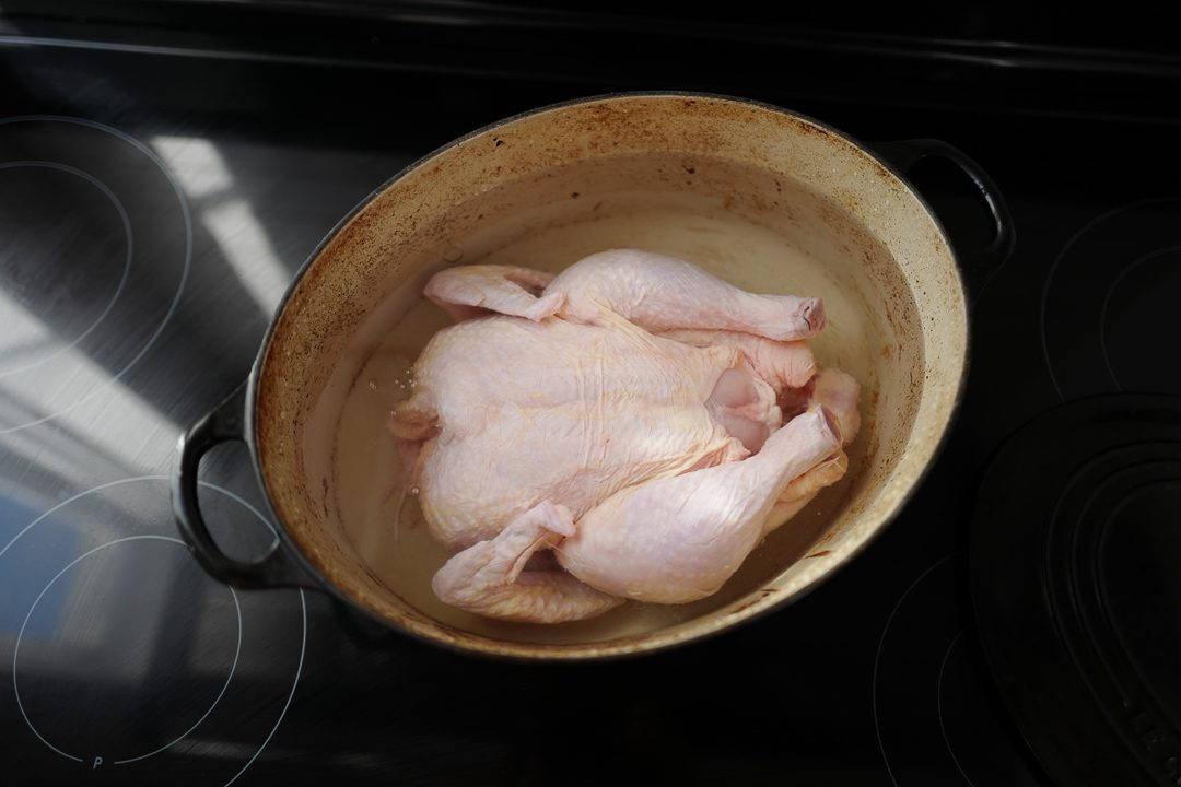 Start med å vaske og skylle kyllingen godt innvendig og utenpå. Tørk. Legg i gryte med kaldt vann. Du trenger ca 4 liter vann. Sett på platen og kok opp. Legg på lokk.