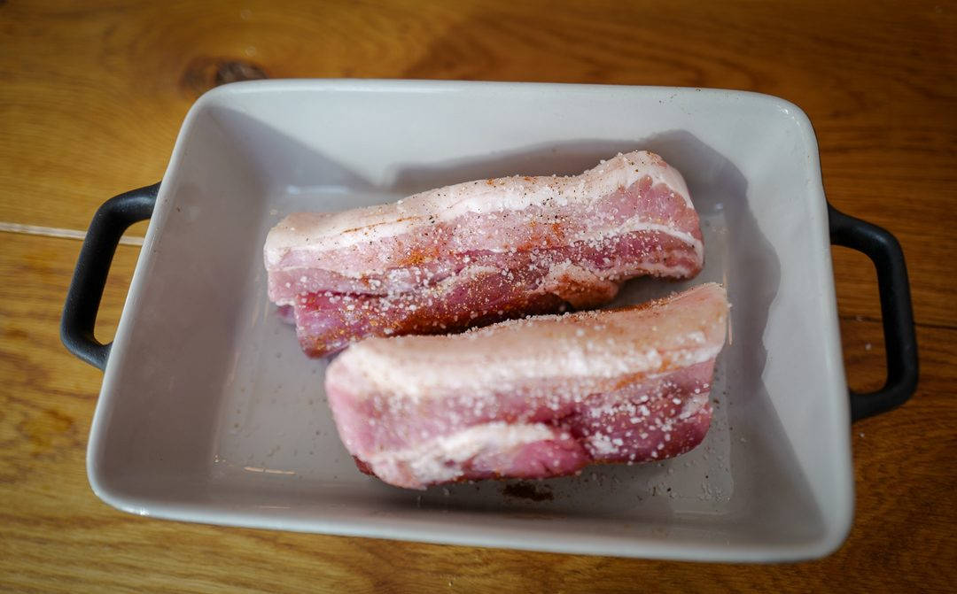 Salt og pepre ribben godt. Dryss five spice-krydder over skinn og kjøtt.
