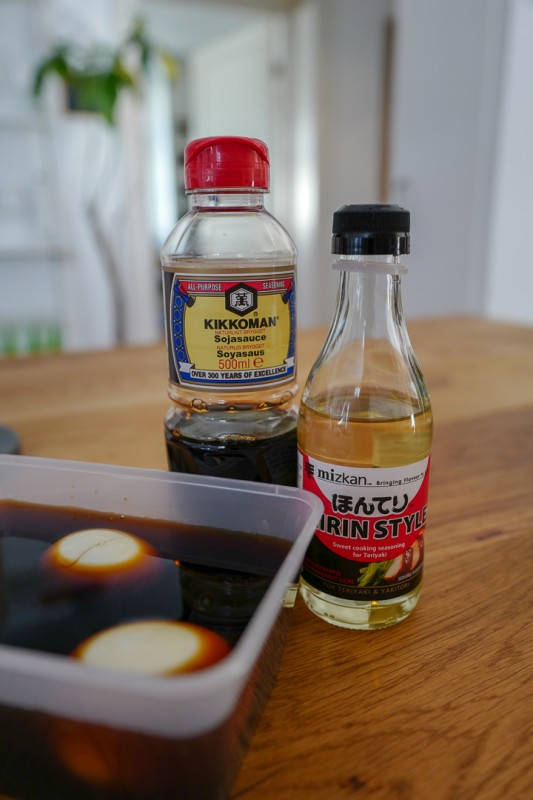 Hell soyasaus, mirin, sukker og vann i en beholder. Kok store egg i 8 minutter. Avkjøl og skrell dem. Legg dem i soya-blandingen. La dem ligge i denne blandingen i minimum fire timer. Ta dem opp, tørk dem og del dem i to rett før servering.