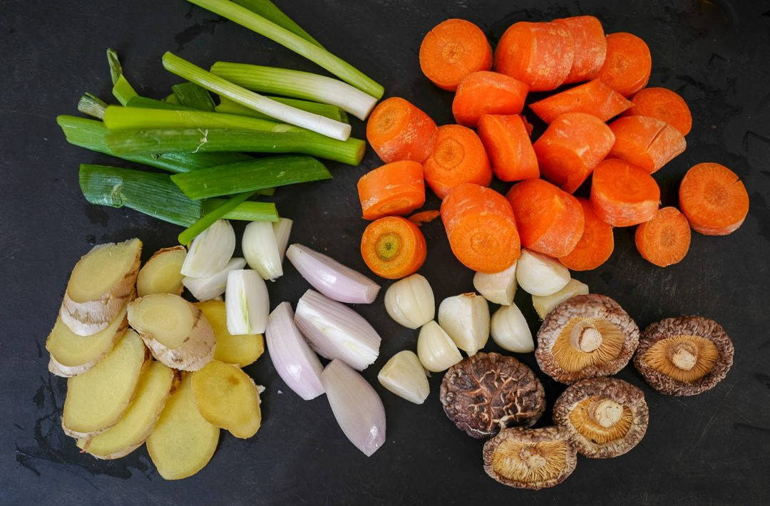 Ribb kyllingen og ta vare på kjøttet. Dette kjøttet kan du brukte til alt i hele verden. Legg kyllingbeina tilbake i gryten sammen med grønnsaker: løk, hvitløk, sopp, vårløk, gulrot og ingefær. Hell på 1/2 dl vanlig soyasaus fra Kikkoman. Dette skal krydre kraften.