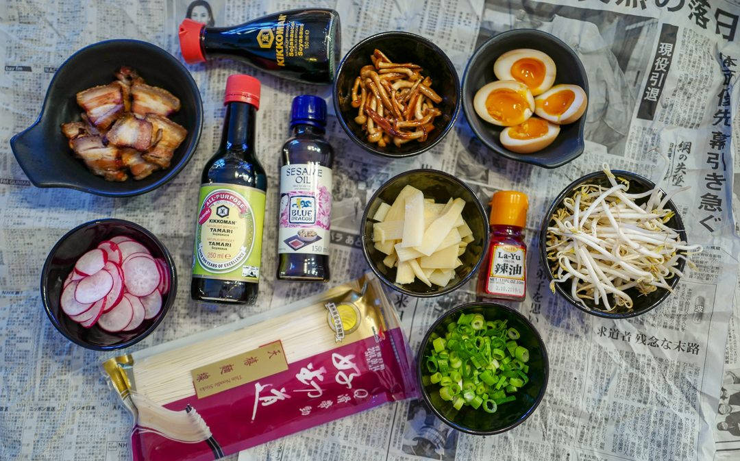 Tilbehør: Chashu (Stekt svinekjøtt), vårløk og bambusskudd.