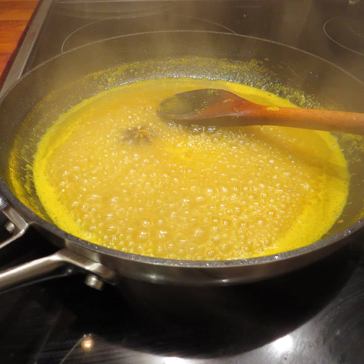 Press saften av 4 søte appelsiner. Ha det i en varm panne. Tilsett 1 ts revet apelsinskall, 1 stjerneanis og 4 cl anisbrennevin (Ouzo, Pernot, Pastis, arak…)