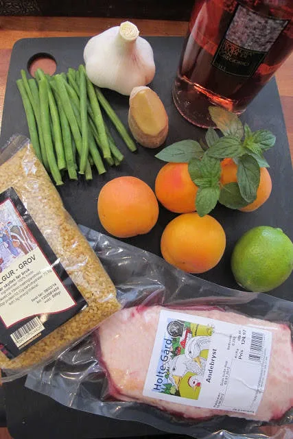 | bulgur, aspargesbønner, aprikoser, mynte, lime, ingefær og hvitløk. Riktig med rosevin:-) |