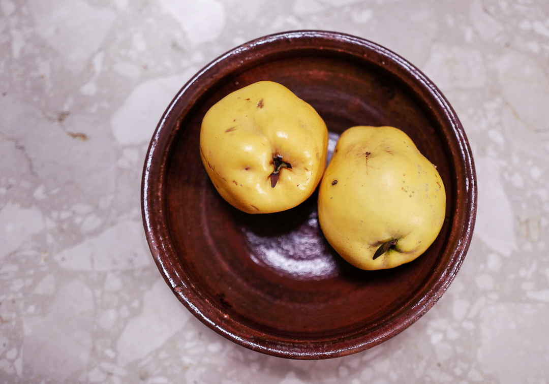 - Start med kvedene: Del dem i fire og ta ut kjernehuset. Legg i ildfast form sammen med skiver av klementin og en kvist rosmarin. Ringle litt honning over og legg smør i fomen. Sett i ovnen på 180 grader i ca 1 time eller til kvedene er møre. De skal være nesten helt myke.