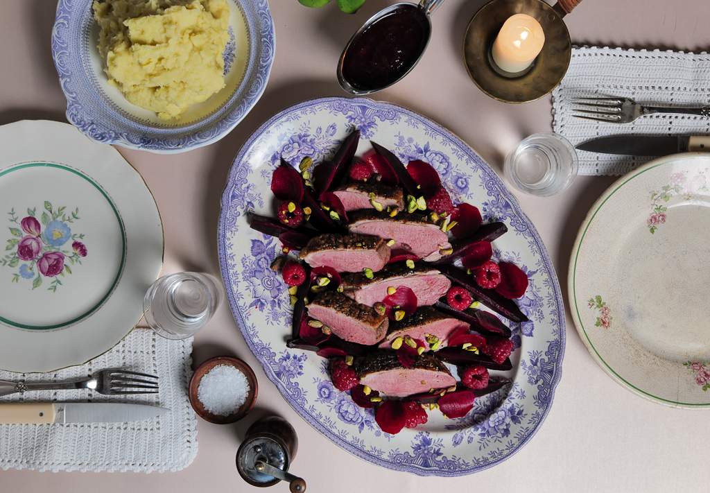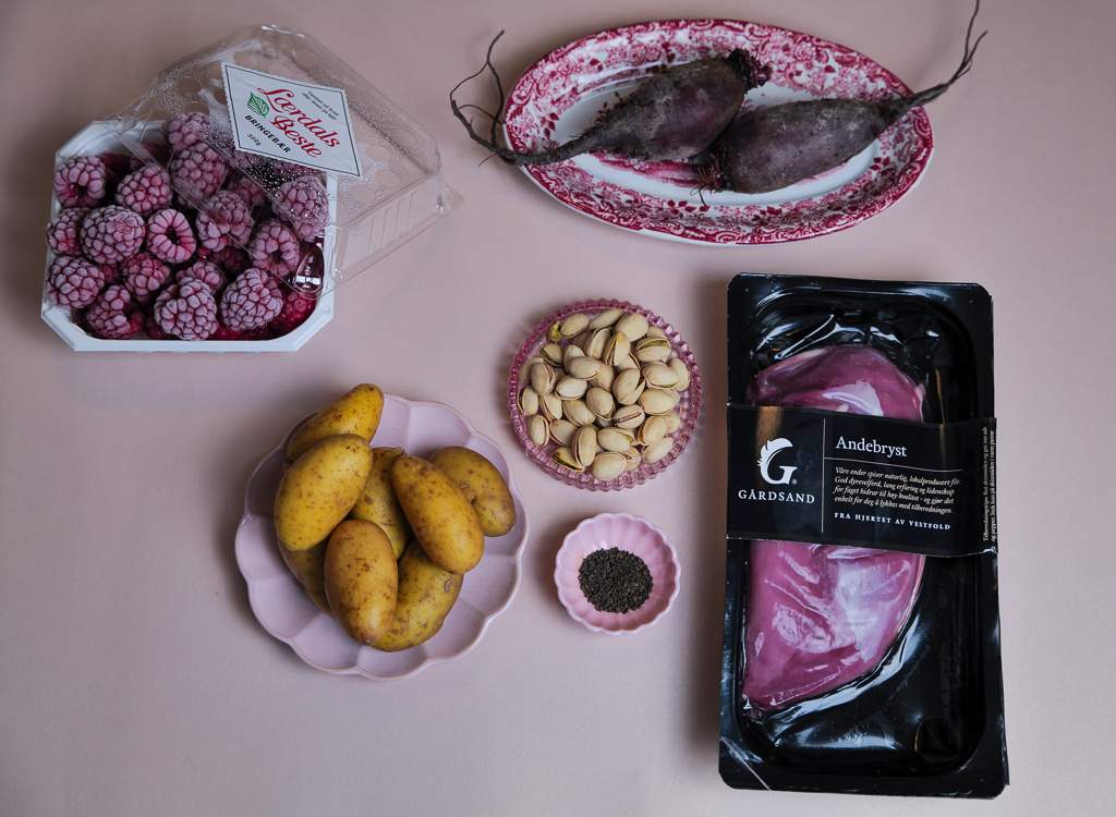 Jeg lager puré av mandelpoteter med masse smør. Betene lager jeg på tre måter: Bakt i ovnen, lynsyltede skiver med stjerneanis og i sausen. Bringebær er ikke i sesong, men det finnes flotte, norske kvalitetsbringebær fra Lærdal i noen Meny- og Jacobs-butikker. Du har kanskje noen i fryseren selv? Pistasjnøttene er deilige som krønsj på toppen av retten. I den lille skålen ligger rålakris. Det er enkelt å få tak i enten som fint eller grovt pulver. Får du tak i grovt er det å foretrekke. Ikke gå for laksispulver fra godteavdelingen. Rålakris er noe helt annet og du finner det i krydderhylla. Hvorfor lakris? Jo, det fremhever andesmaken og gir så mye ekstra til retten. Og ikke bare det: Beter og bringebær er bestevenner med lakris.