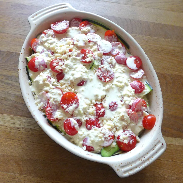 Grønnsaksformen lager du enkelt ved å skjøre tynne, tynne skiver (gjerne med en mandolin) av aubergin, squash, tomater og poteter. Legg lagvis og tilslutt drysser du brødkrummer over (gjerne panko) og heller over 2 dl fløte tilsatt salt, pepper og 1 fedd knust hvitløk. Litt revet parmesan på toppen og så i ovnen på 180 grader i ca 1 time.