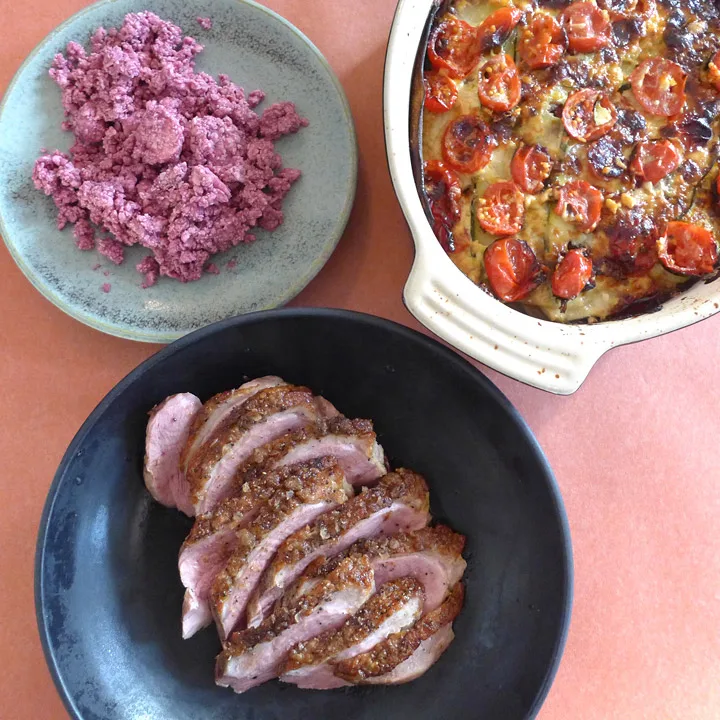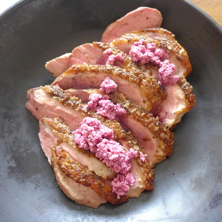 Jeg serverer dette andebrystet med et hjemmelaget rødvinssmør som smelter over det varme andekjøttet og danner en superlekker saus.