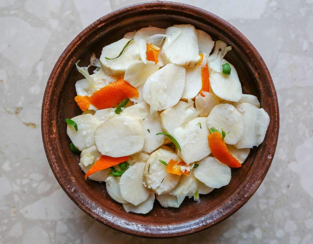 Dandér skiver av jordskokk, rosmarin, appelsinskall og hvitløk.