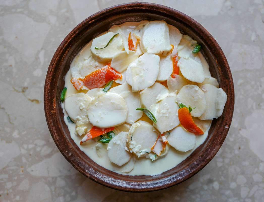 - Gratinerte jordskokker: Skrell jordskokker og skjær dem i skiver. Legg dem lagvis i en ildfast form og legg hvitløksskiver inn i mellom. Remsen med appelsinskall deler du i tre og legger inn i mellom jordskokkskivene sammen med noen rosmarinblader. Salt og peper og hell over fløten. Sett i ovnen på 180 grader i ca en time eller til jordskokkene er myke. Rør litt i formen midt i stekeprosessen.