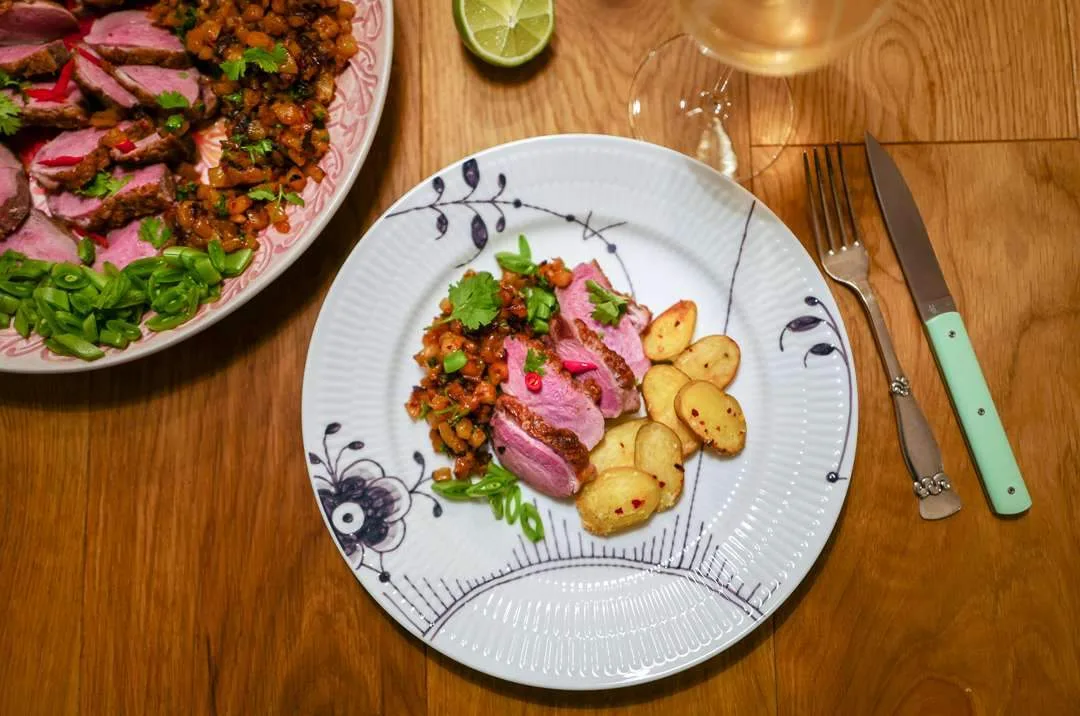 And er en av de letteste råvarene å kombinere med søtt eller salt. Derfor smaker and med appelsinsaus så godt. Men and passer til så mye mer. Ananas for eksempel. Så da lagde jeg rett og slett en oppskrift på and med ananas og ovnstekte poteter. Du trenger ikke saus til retten for ananaschutneyen er fruktig og gir nok fuktighet til retten.
