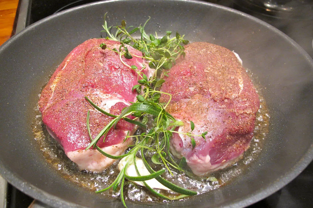 Det du gjør først er å vaske og tørke andebryst. Store andebryst ligger på 350 gram, og er nok til to personer. Snitt fettet med en skarp kniv. Rut det slik du gjør med ribben. Ikke skjær ned i kjøttet. Gni andebrystene inn med masse salt, pepper og et tynt lag fivespicekrydder. Du får kjøpt denne krydderblandingen i de fleste matbutikker. Varm en stekepanne og legg fettsiden ned på høy varme. Fettet vil nå smelte og du kan tilsette aromater som timian, rosmarin (hvis du vil bruke to urter. Det holder med timian hvis du bare har det) og hvitløk i pannen.