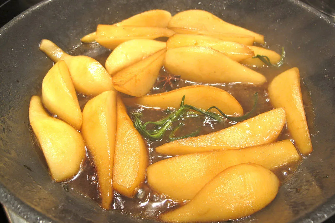 I en varm panne smelter du 4 ss brunsukker. Tilsett et shotglass amerikansk whskey. Jeg brukte Maker’s Mark, for den er ikke for parfymert. Så tilsetter du 3 ss smør og to stjerneanis, samt en kvast rosmarin eller timian. Press saften av en klementin. Hell på 3 ss av andekraften og legg pærene i. Senk temperaturen til medium og la pærene bli myke og karamelliserte. Strø en klype flaksalt over pærene.