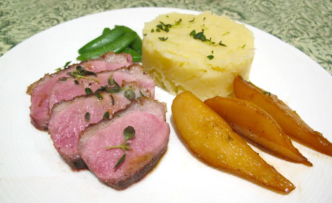 Server andestykker med potetmos og noen dampede sukkererter sammen pærene og den deilige kraften. Dette, mine damer og herrer, er jul på en tallerken! Kos dere!