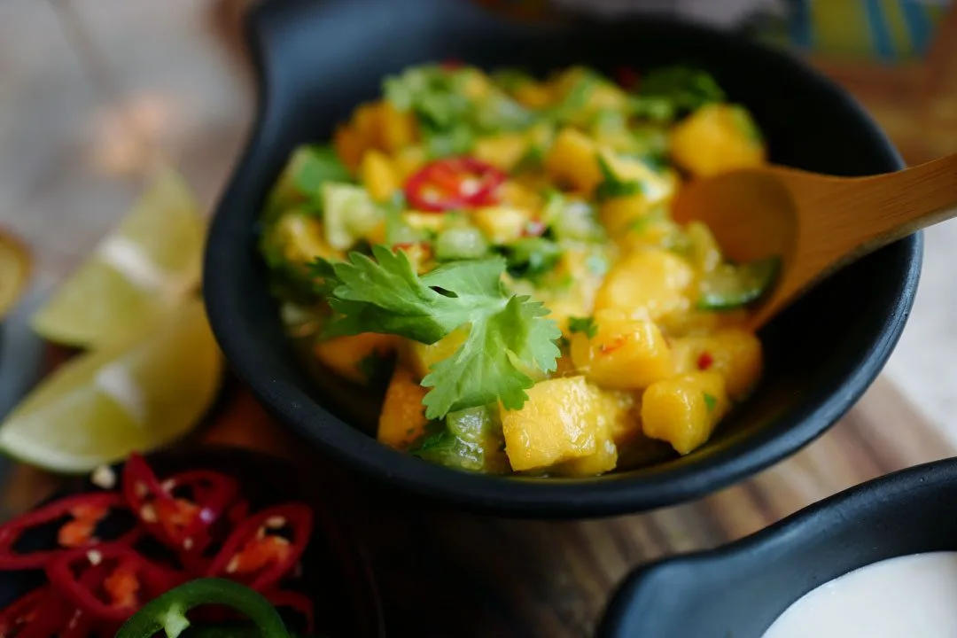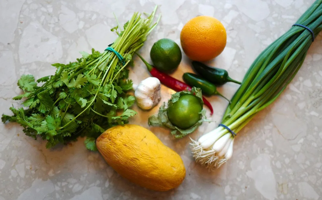 And passer til alt! Frukt, urter, chili, hvitløk… Derfor lager jeg en spenstig salsa av tomatillo og moden mango. Du skjærer begge i små terninger og blander med hakket rød chili og masse koriander. Press saften av 1 lime og 1/4 appelsin over. La dette så marinere en halvtime før du serverer den. Det kan være lurt å helle av litt væske rett før servering, for sitrusen trekker ut fuktighet fra tomatilloen og mangoen.