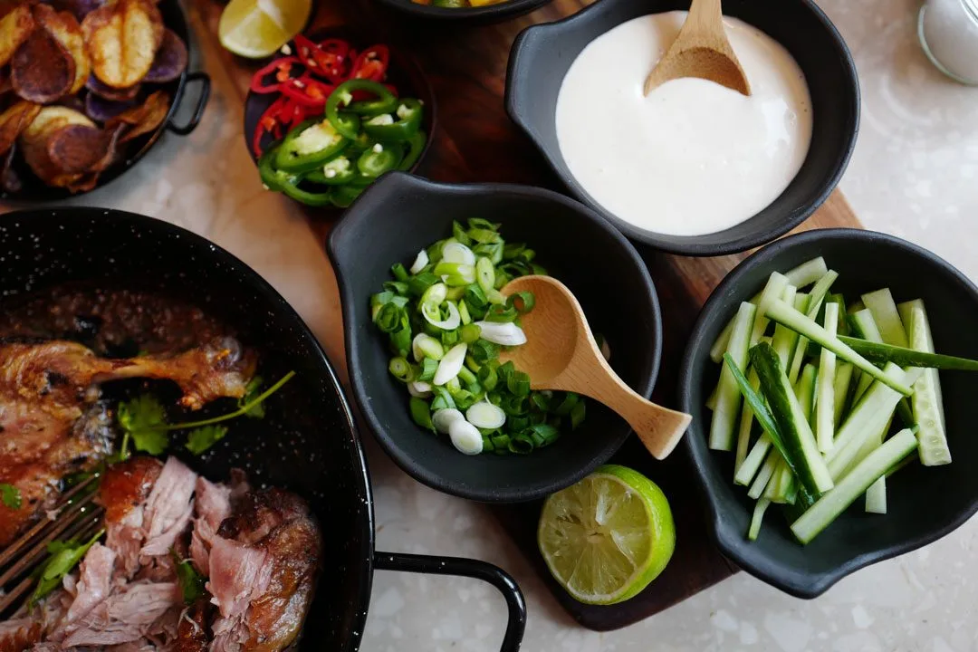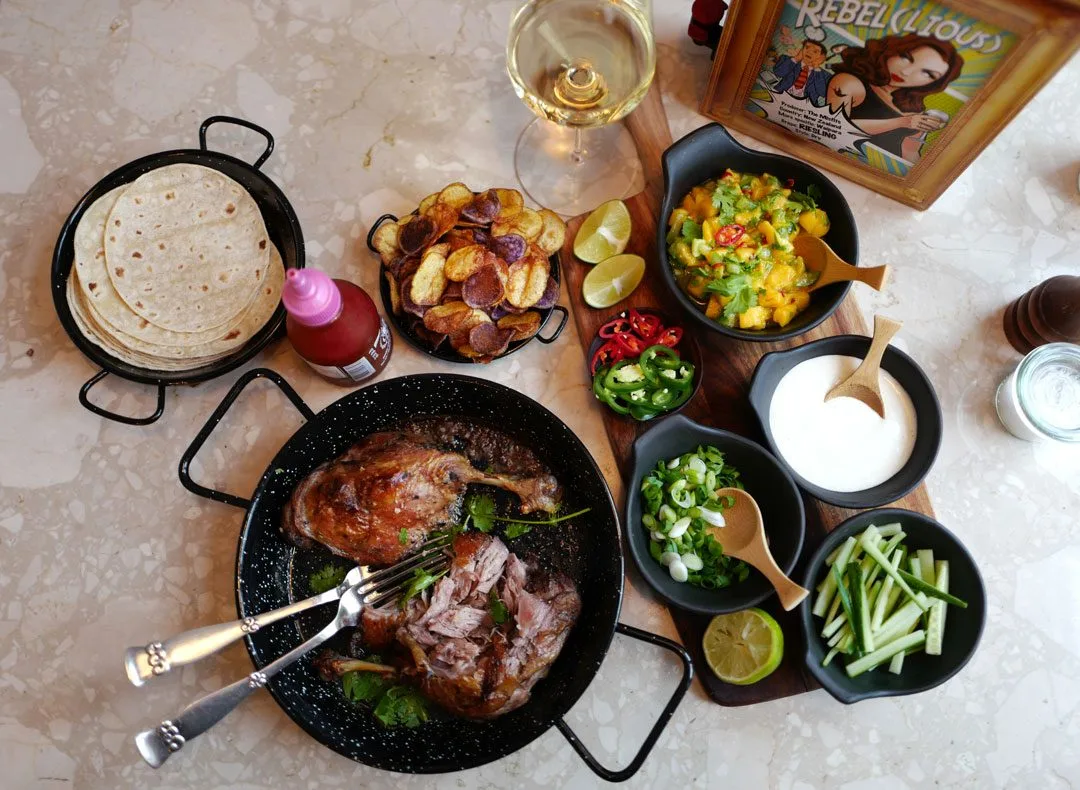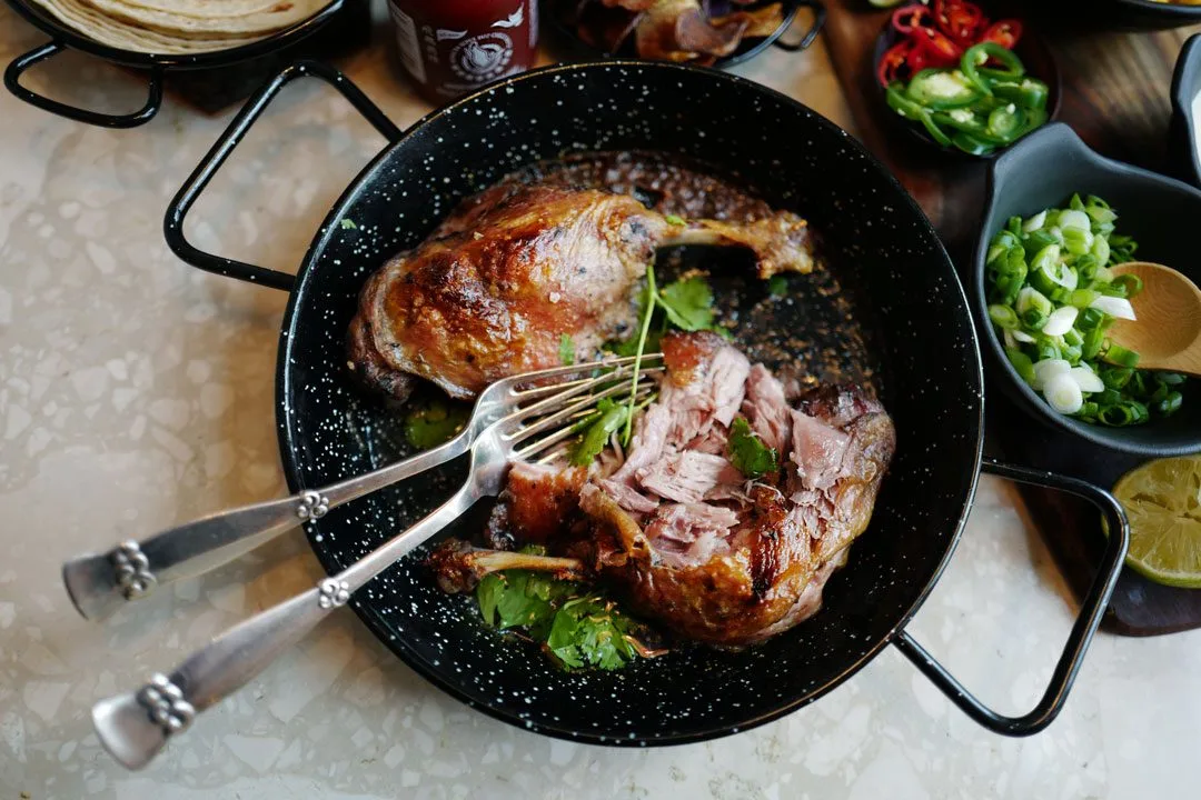 Anden: Jeg bruker konfiterte andelår. Disse ligger i to-pakk i butikken. Du klipper opp posen og legger lårene (med skinnsiden opp) i en ildfast form (med fettet og kraften som ligger i posen). Så setter du anden under grillen i ovnen og lar den bli varm og sprø. Kjøttet river du enkelt fra hverandre med to gafler. Det er som pulled pork. Not pork. Duck.