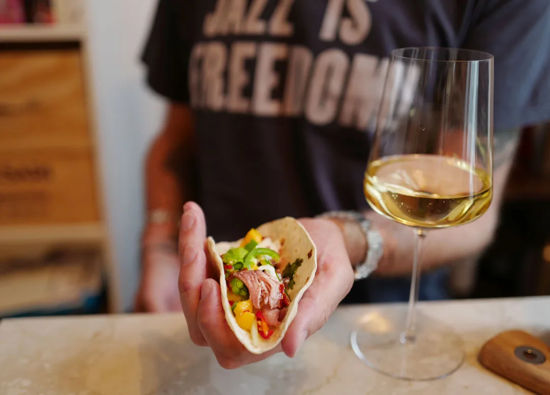 Men du kan også drikke en frisk hvitvin til. Jeg har valgt meg en tørr riesling fra New Zealand. Rebel(lious) Riesling by the Misfits kommer i treliters-kartong. Jeg er ikke så fan av å ha kartonger på bordet når jeg har gjester, men denne var såpass vakker at den passerer. Dessuten er andetacos et himla søl å spise, så det passer bra at man kan forsyne seg selv fra kartongen. Jeg er opptatt med å spise og mekke ny taco, så her får gjesten føle seg hjemme. Ser ut som om det fungerer helt fint.