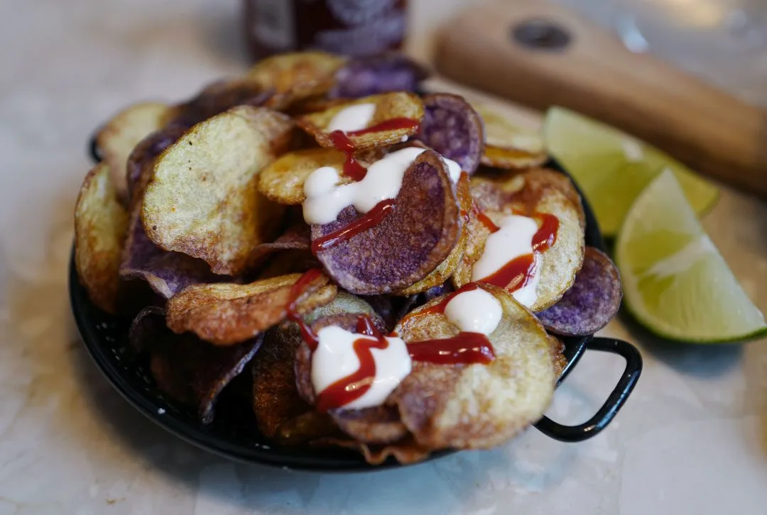 Chips: Finn noen deilige, norske poteter og noen blåpoteter (Blå Kongo). Snitt dem tynt og friter dem i nøytral olje.