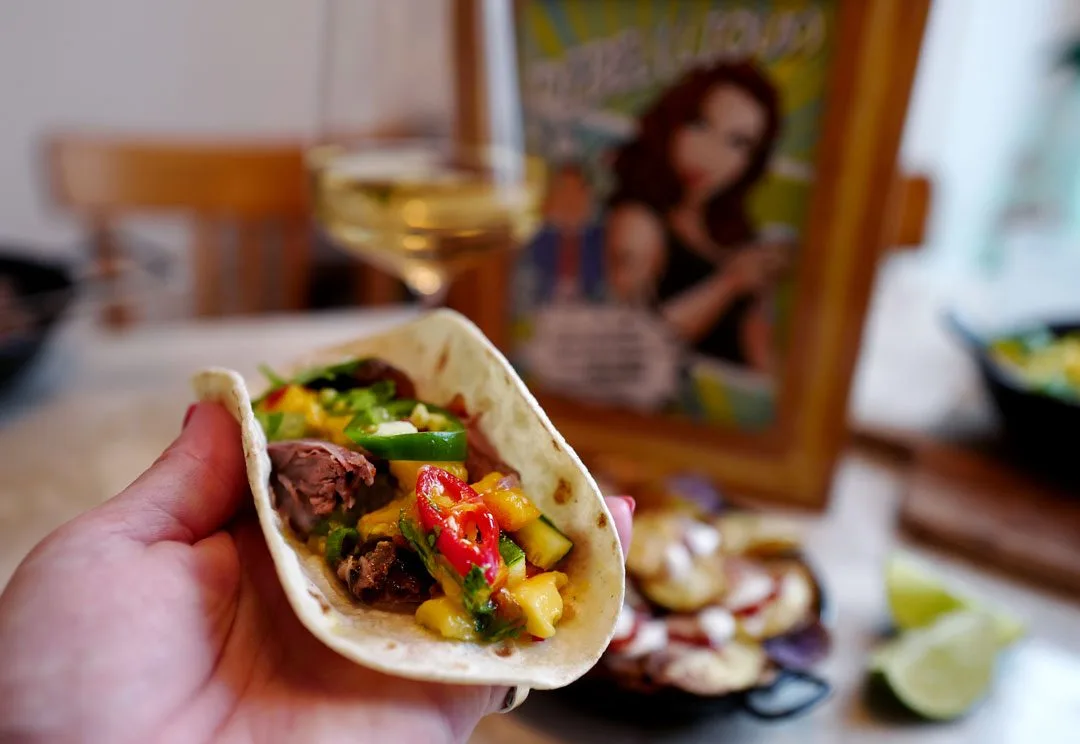 Ok, helt malapropos. Jeg har laget en taco med alt som jeg synes er godt: Konfitert andekjøtt, sterk chili, mango- og tomatillosalsa, lime- og hvitløksdressing og potetchips med tacokrydder. Det høres kanskje avansert ut, men jeg har mine triks. Den konfiterte anden får du ferdig i butikken, så den skal bare varmes under grillen. Tortillalefsene kan du lage selv. Jeg har kjøpt mine i vanlig butikk. Det er ikke alltid jeg trenger å lage alt fra bunnen av. Tortillalefser er en av de greiene.