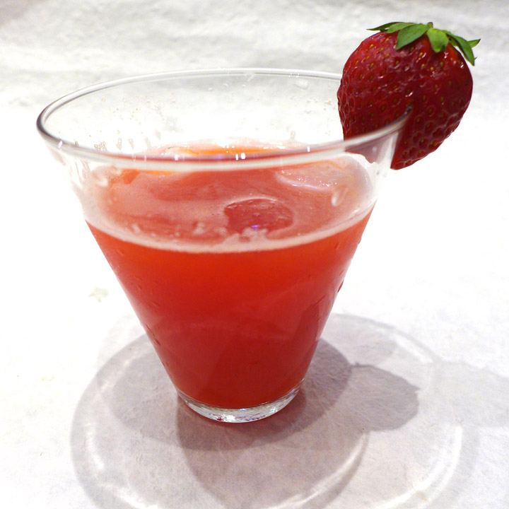 Bland i et glass. Fyll i noen isbiter og sett et jordbær på kanten av glasset.