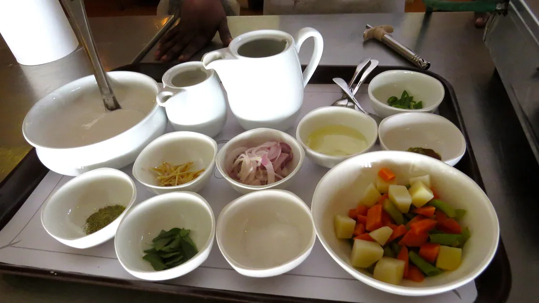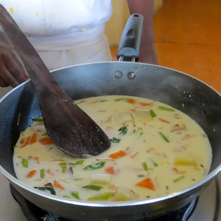 De ferdigkokte grønnsakene tilsettes i pannen sammen en klype salt og malt kardemomme. Tilsett 2 dl vann og la dette småkoke i 3 min før du tilsetter 1 boks kokosmelk. La dette surre i ca. 5 min før du serverer med appam.