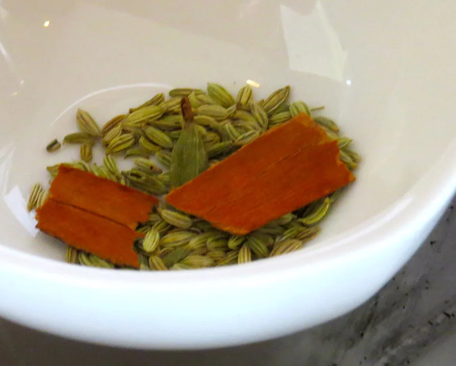 Varm en panne og tilsett kokosoljen. Tilsett krydderne, løk og ingefæren. La dette surre på middels varme til løken er myk. Så tilsetter du karriblader (du får kjøpt tørkede karriblader i mange grønnsaksbutikker, og ferske får du i asiatiske butikker) og grønn chili i ringer.